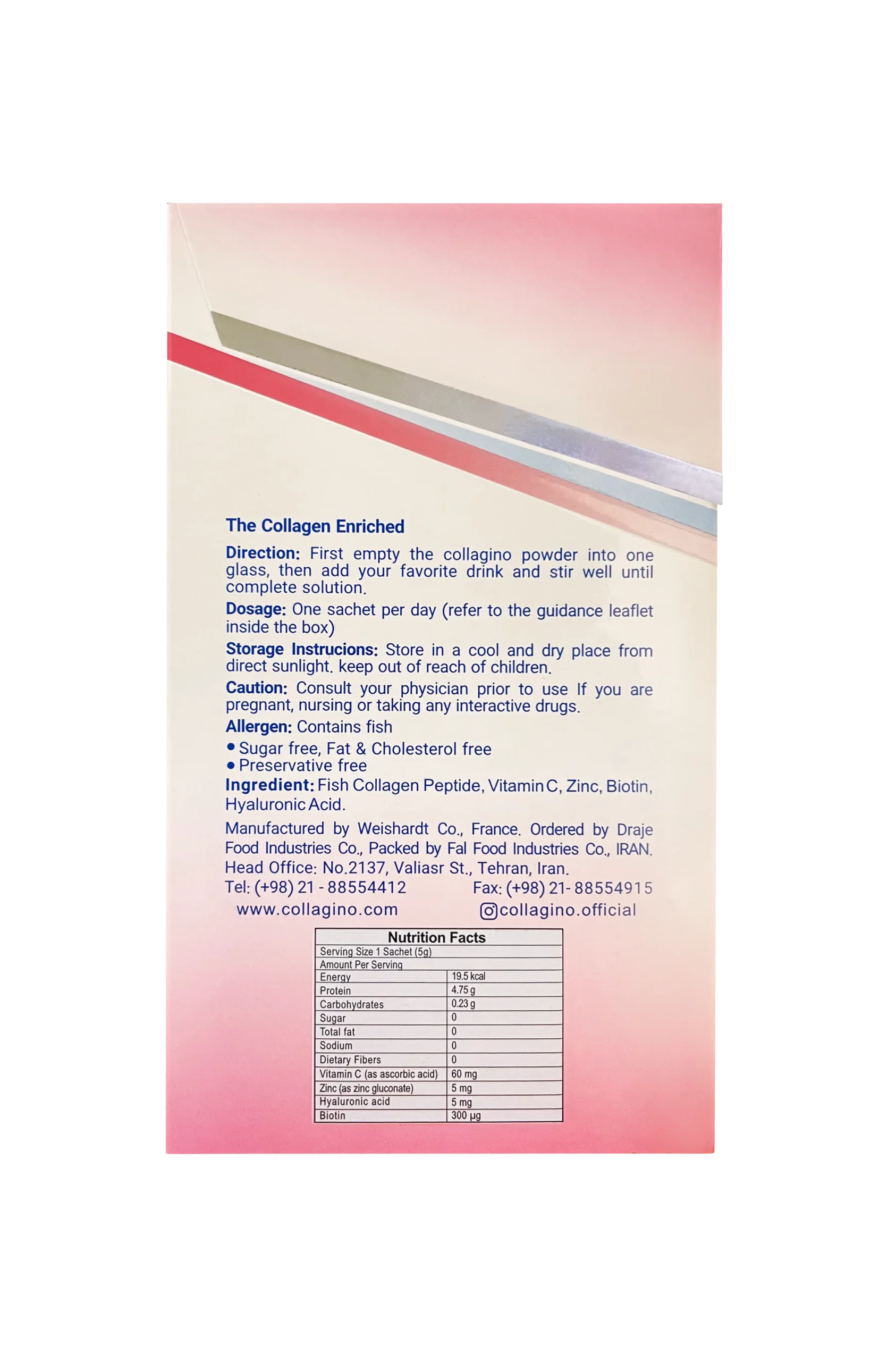 روزانه یک ساشه را در یک لیوان آب یا نوشیدنی دلخواه حل کرده و مصرف کنید. مصرف با معده خالی یا بعد از غذا تفاوتی ندارد.